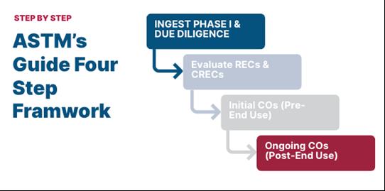 Steps 1 and 2 cover processes to ingest the due diligence and evaluate the recognized environmental conditions. Then, with that understanding, steps 3 and 4 recommend a process for addressing what the Standard Guide describes as initial and ongoing COs.