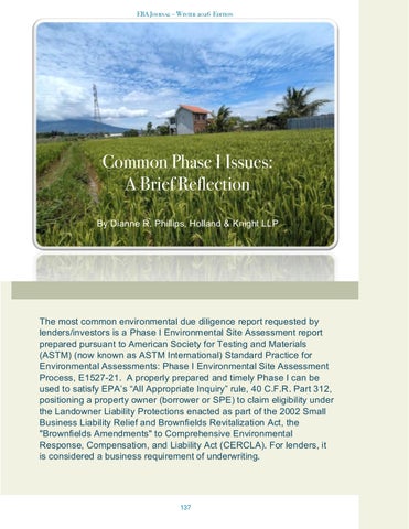 The most common environmental due diligence report requested by lenders/investors is a Phase I Environmental Site Assessment report prepared pursuant to American Society for Testing and Materials (ASTM) (now known as ASTM International) Standard Practice for Environmental Assessments: Phase I Environmental Site Assessment Process, E1527-21. A properly prepared and timely Phase I can be used to satisfy EPA’s “All Appropriate Inquiry” rule, 40 C.F.R. Part 312, positioning a property owner (borrower or SPE) to claim eligibility under the Landowner Liability Protections enacted as part of the 2002 Small Business Liability Relief and Brownfields Revitalization Act, the "Brownfields Amendments" to Comprehensive Environmental Response, Compensation, and Liability Act (CERCLA). For lenders, it is considered a business requirement of underwriting.