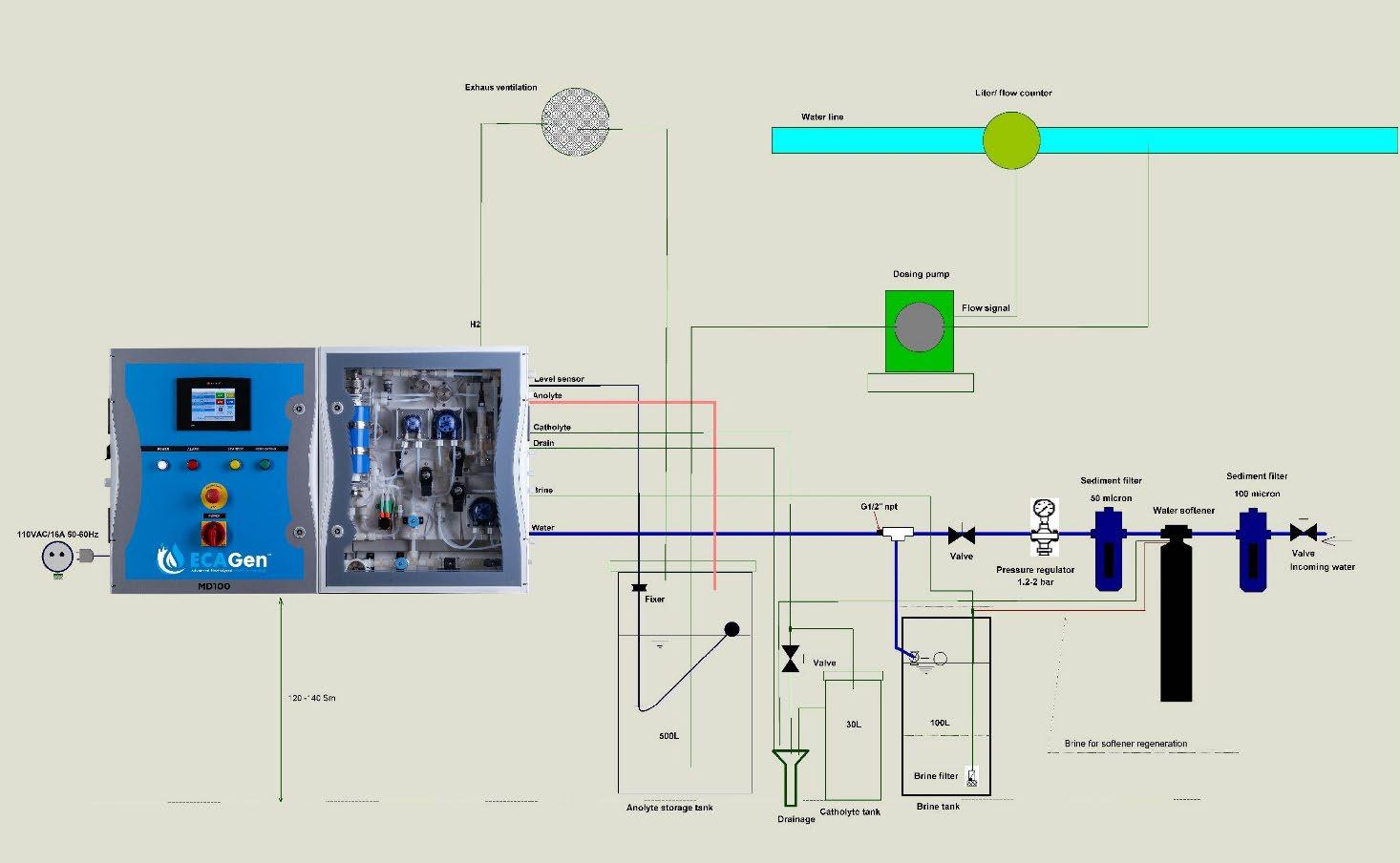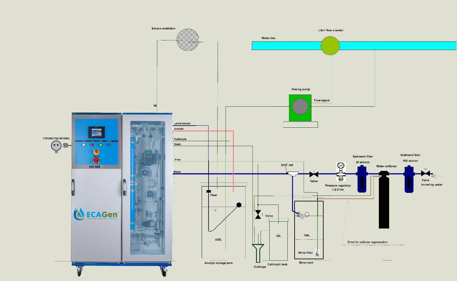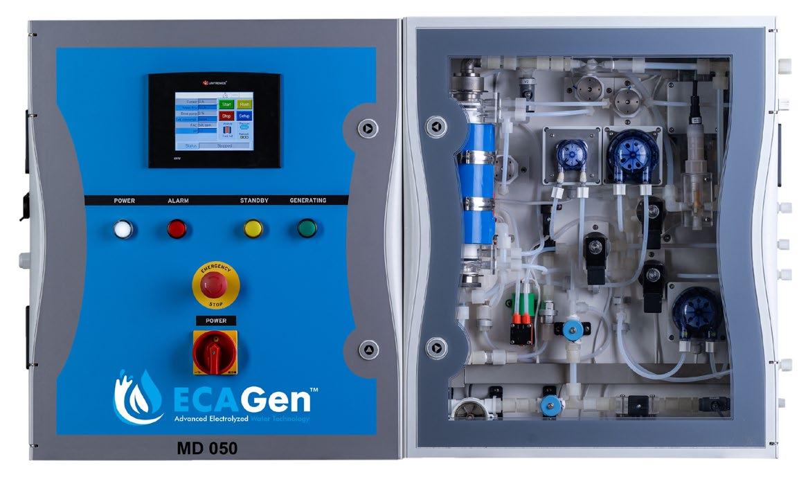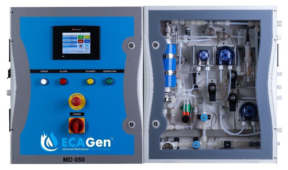 System Max Output (Liters) 24/7 Production 500ppm Anolyte/HR 49 500ppm Anolyte/Day 588 500ppm Anolyte/Week 4,116 500ppm Anolyte/Month 17,698 *Catholyte/HR 1 *Catholyte/Day 12 *Catholyte/Week 84 *Catholyte/Month 361