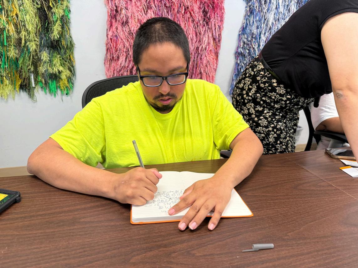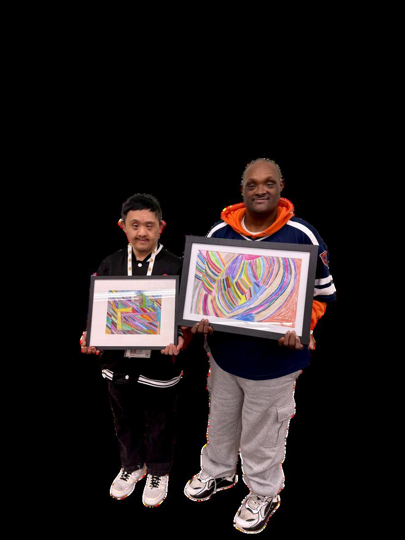 We went with Jenny. Take a picture. Art working. They paint this. Pictures. Pictures of Christine and me. My [Marcel’s] favorite part was the video with the headphones. My [Christine’s] favorite part was the framed picture