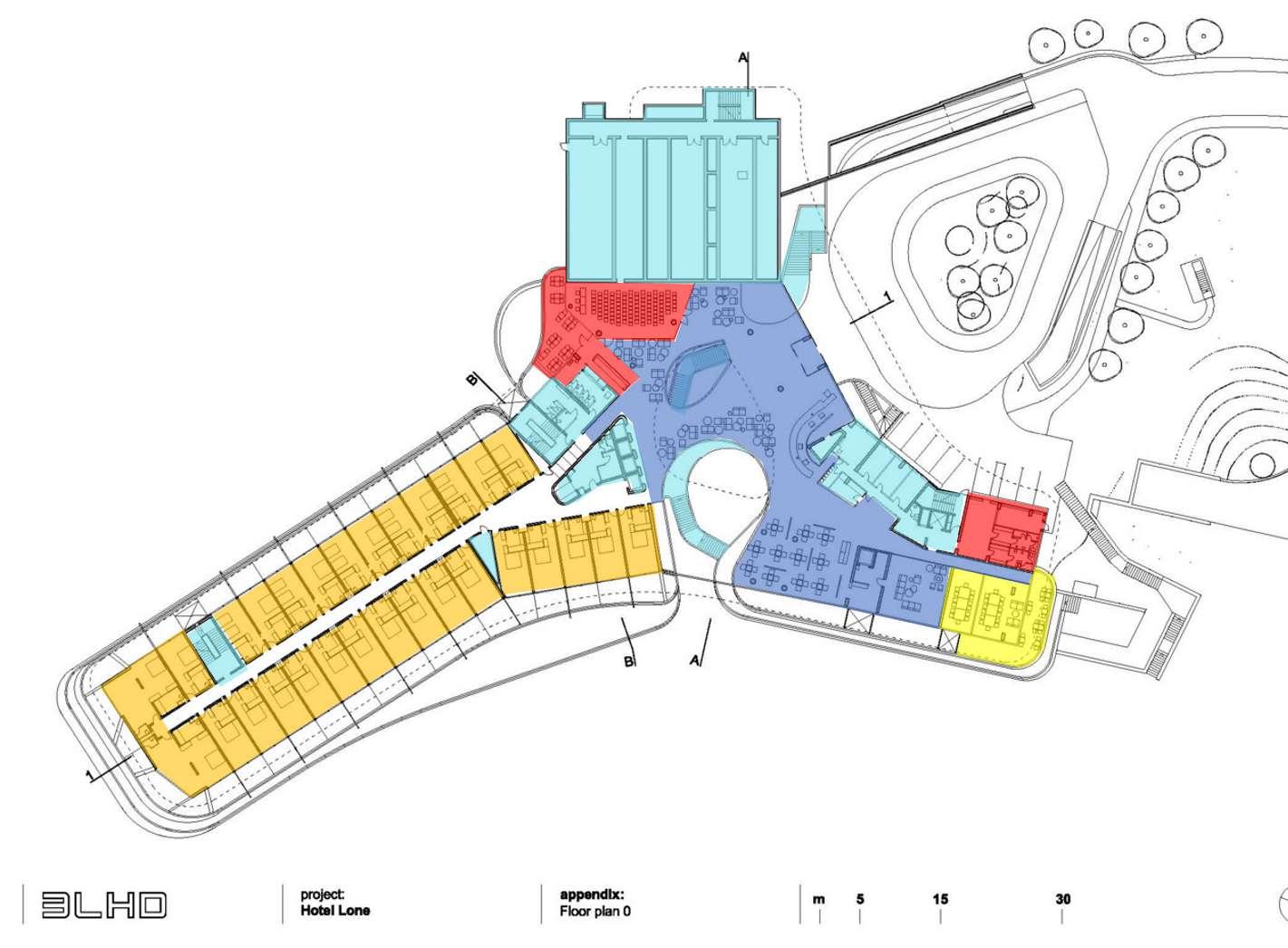 En el hotel, se puede concluir que usan las primeras plantas para usos de gran demanda comercial, mientras que para el ingreso al hospedaje se utiliza pisos de transicion como los servicios y zonas sociales para generar un grado mas intimo hacia el acceso de las habitaciones