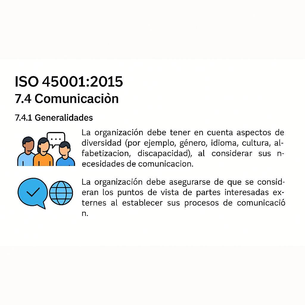 La organización debe tener en cuenta aspectos de diversidad (por ejemplo, género, idioma, cultura, alfabetización, discapacidad), al considerar sus necesidades de comunicación.