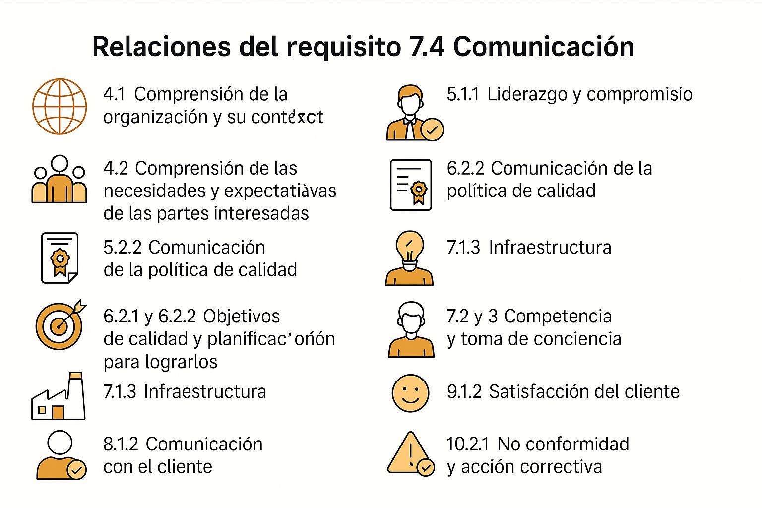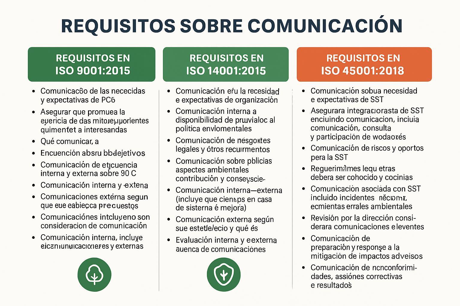 Igual que ISO 9001, añade comunicación externa y cumplimiento legal