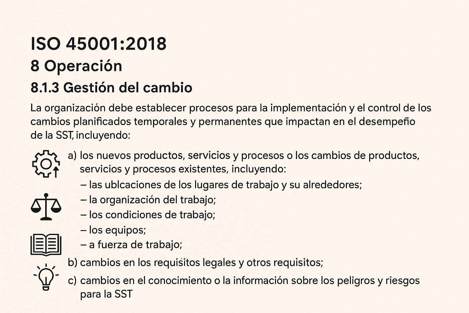 La organización debe establecer procesos para la implementación y el control de los cambios planificados temporales y permanentes que impactan en el desempeño de la SST, incluyendo: a) los nuevos productos, servicios y procesos o los cambios de productos, servicios y procesos existentes, incluyendo: las ubicaciones de los lugares de trabajo y sus alrededores; la organización del trabajo; las condiciones de trabajo; los equipos; la fuerza de trabajo;