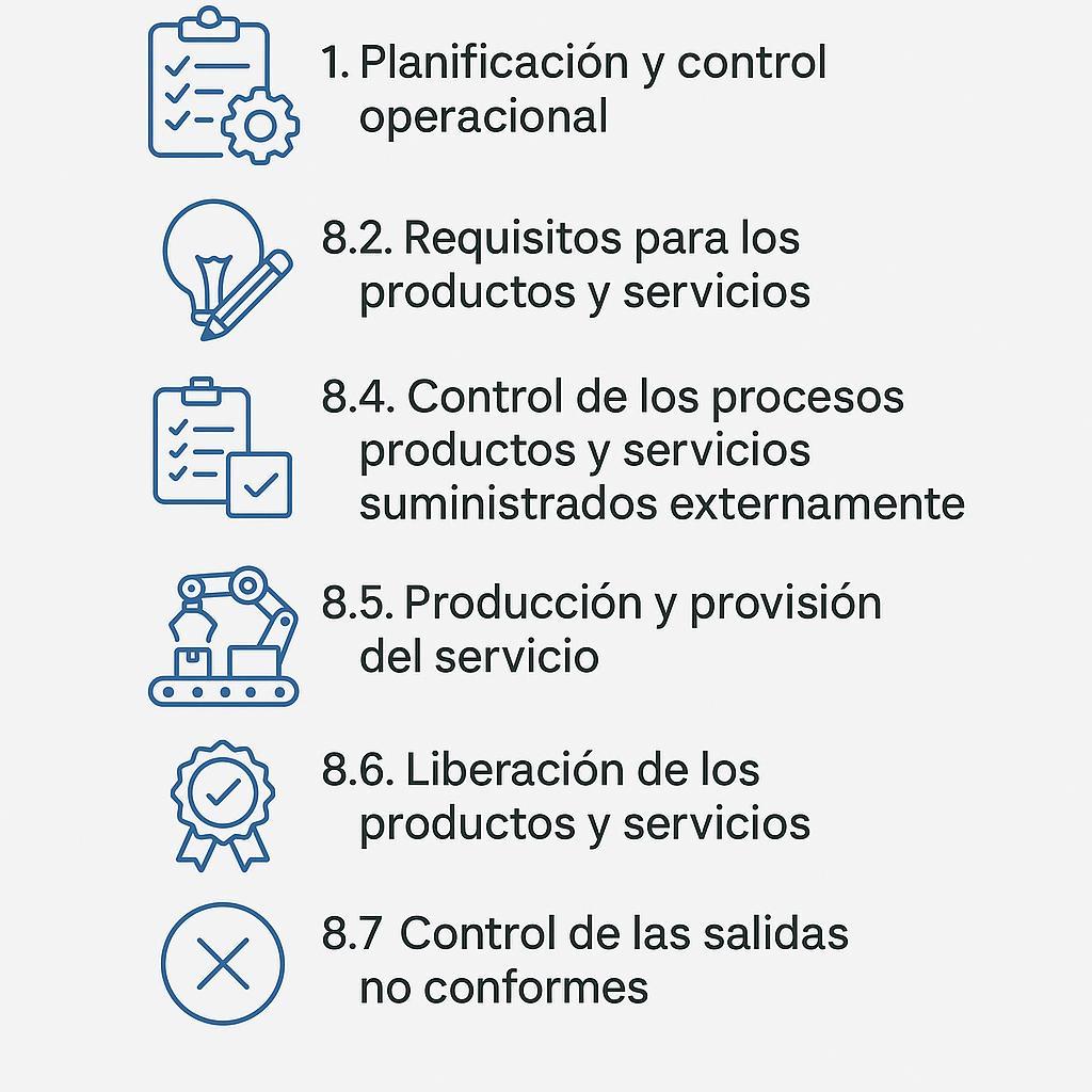 8.1 Planificación y control operacional Requiere planificación, implementación y control de procesos para cumplir con requisitos del producto y servicio y prevenir no conformidades
