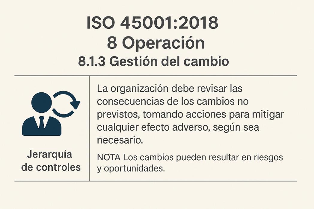 Exige planificación y control operacional para eliminar peligros y reducir riesgos, con énfasis en jerarquía de controles, gestión del cambio y procesos contratados