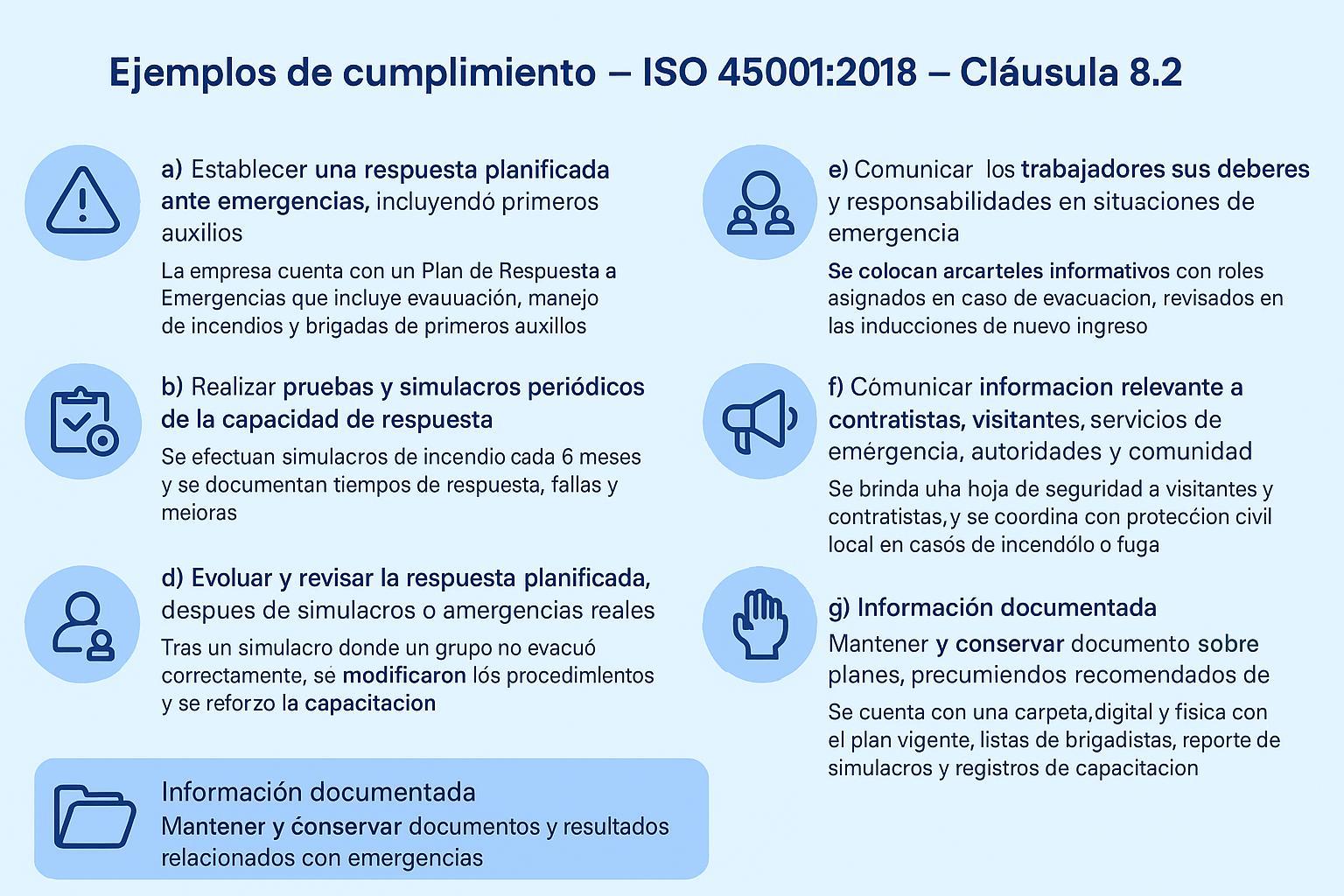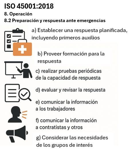 Solo ISO 14001 y 45001 tienen requisitos explícitos de respuesta ante emergencias. ISO 45001 lo orienta a accidentes o eventos de salud y seguridad laboral