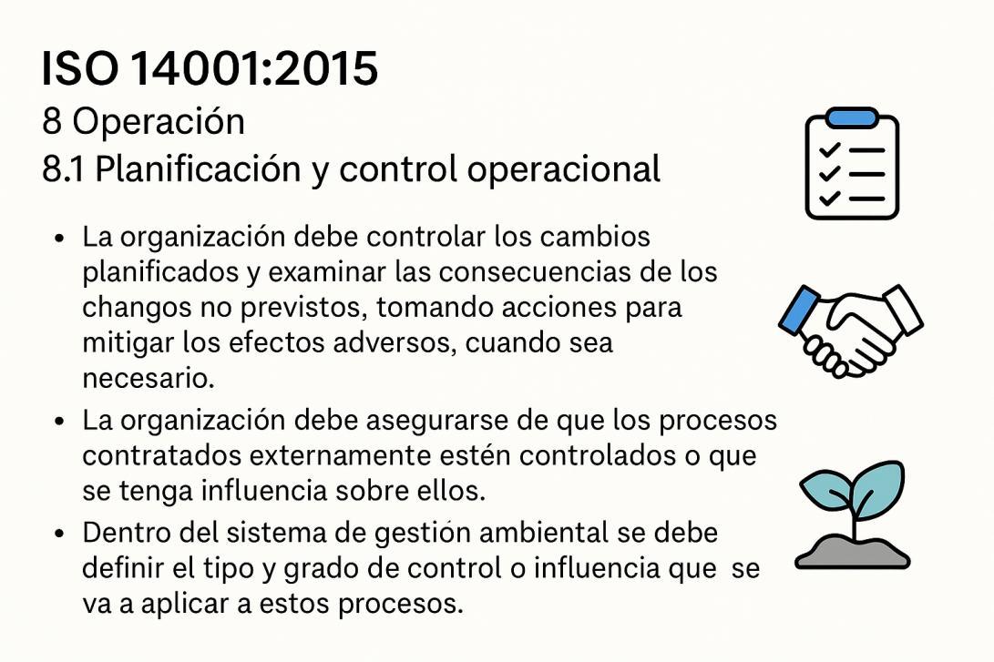 Establece y controla procesos para cumplir el SGA, incluye criterios de operación, ciclo de vida, requisitos ambientales para compras, contratistas, y diseño, control de cambios y procesos externos