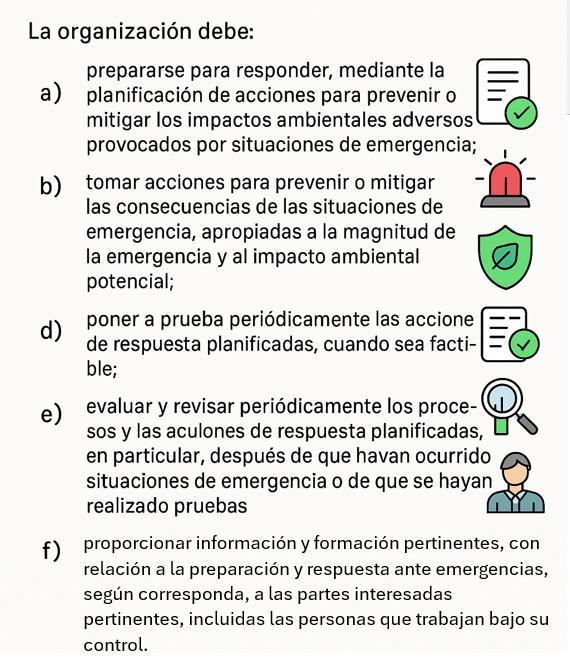 Requiere procesos para emergencias ambientales (derrames, incendios, etc.), incluyendo capacitación y simulacros
