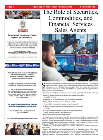 ecurities, commodities, and financial services sales agents deal with a wide range of products and clients. Agents spend much of the day interacting with people, whether selling stock to an individual or discussing the status of a merger deal with a company executive. The work is usually stressful because agents deal with large amounts of money and have time constraints. Securities, commodities, and financial services sales agents typically do the following: • Contact prospective clients to present information and explain available services • Offer advice on the purchase or sale of particular securities • Buy and sell securities, such as stocks and bonds • Buy and sell commodities, such as corn, oil, and gold • Monitor financial markets and the performance of individual securities • Analyze company finances to provide recommendations for public offerings, mergers, and acquisitions • Evaluate cost and revenue of agreements A security or commodity can be traded in two ways: electronically or in an auction-style setting on the floor of an exchange market. Markets such as the National Association of Securities Dealers Automated Quotation system (NASDAQ) use vast computer networks rather than human traders to match buyers and sellers. Others, such as the New York Stock Exchange (NYSE), rely on floor brokers to complete transactions. The following are examples of types of securities, commodities, and financial services sales agents: Brokers sell securities and commodities directly to individual clients. They advise people on appropriate investments based on the client’s needs and financial ability. The people they advise may have very different levels of expertise in financial matters. Finding clients is a large part of a broker’s job. They must create their own client base