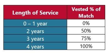 You are immediately 100% vested in your own contributions. Serigraph will contribute 50% on the first 4% of employee contributions. Company contributions are vested on the following schedule: