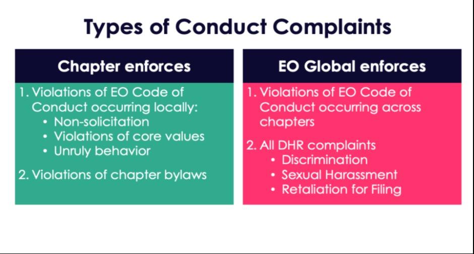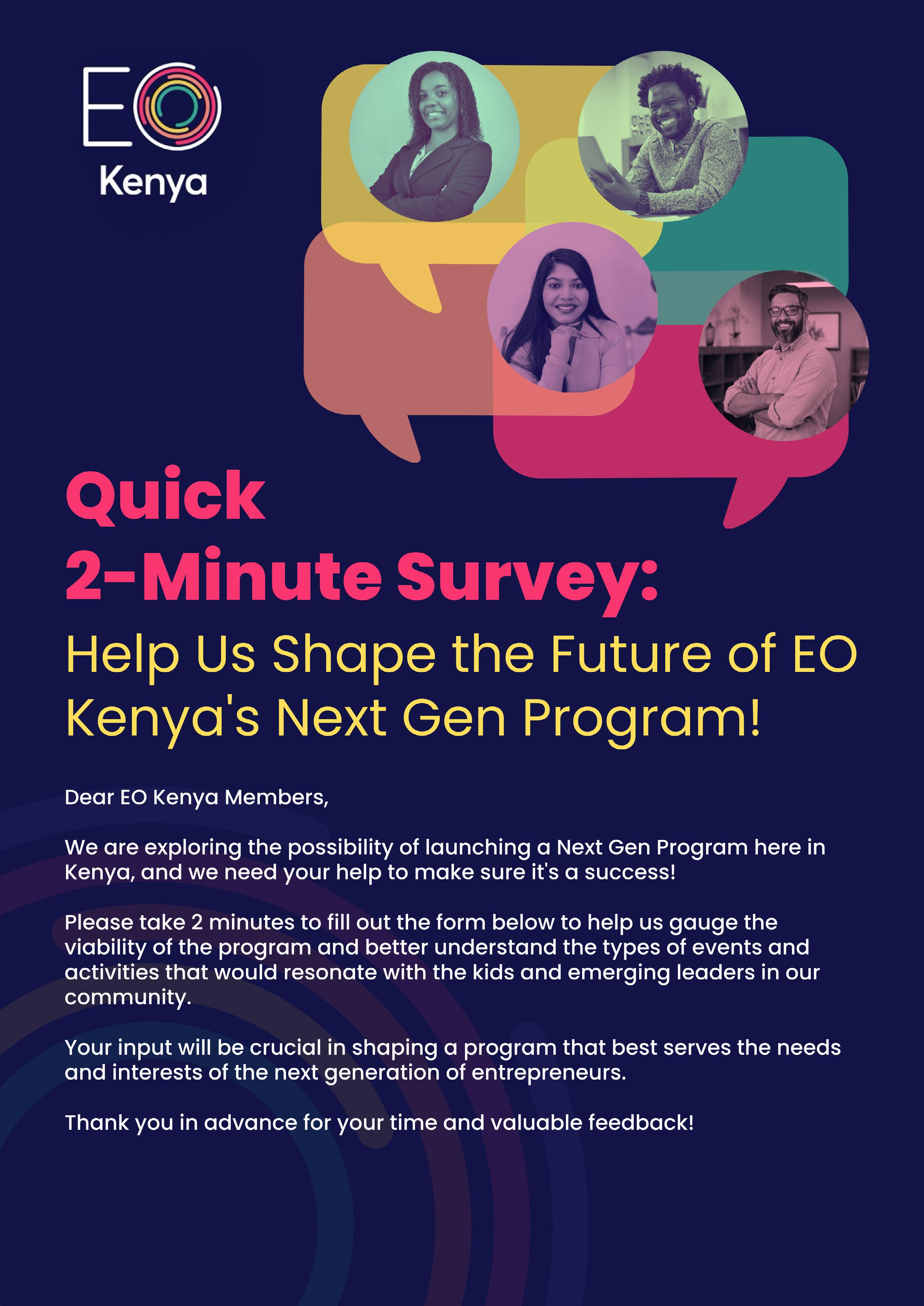 EO Kenya has established a Chapter Conduct Committee to review behaviour inconsistent with EO’s Code of Conduct. This committee is overseen by the Governance Chair Complaints may be sent to: governance@eokenya.org. Members may also reach out directly to EO’s Regional Governance Committee via governance@eonetwork.org .