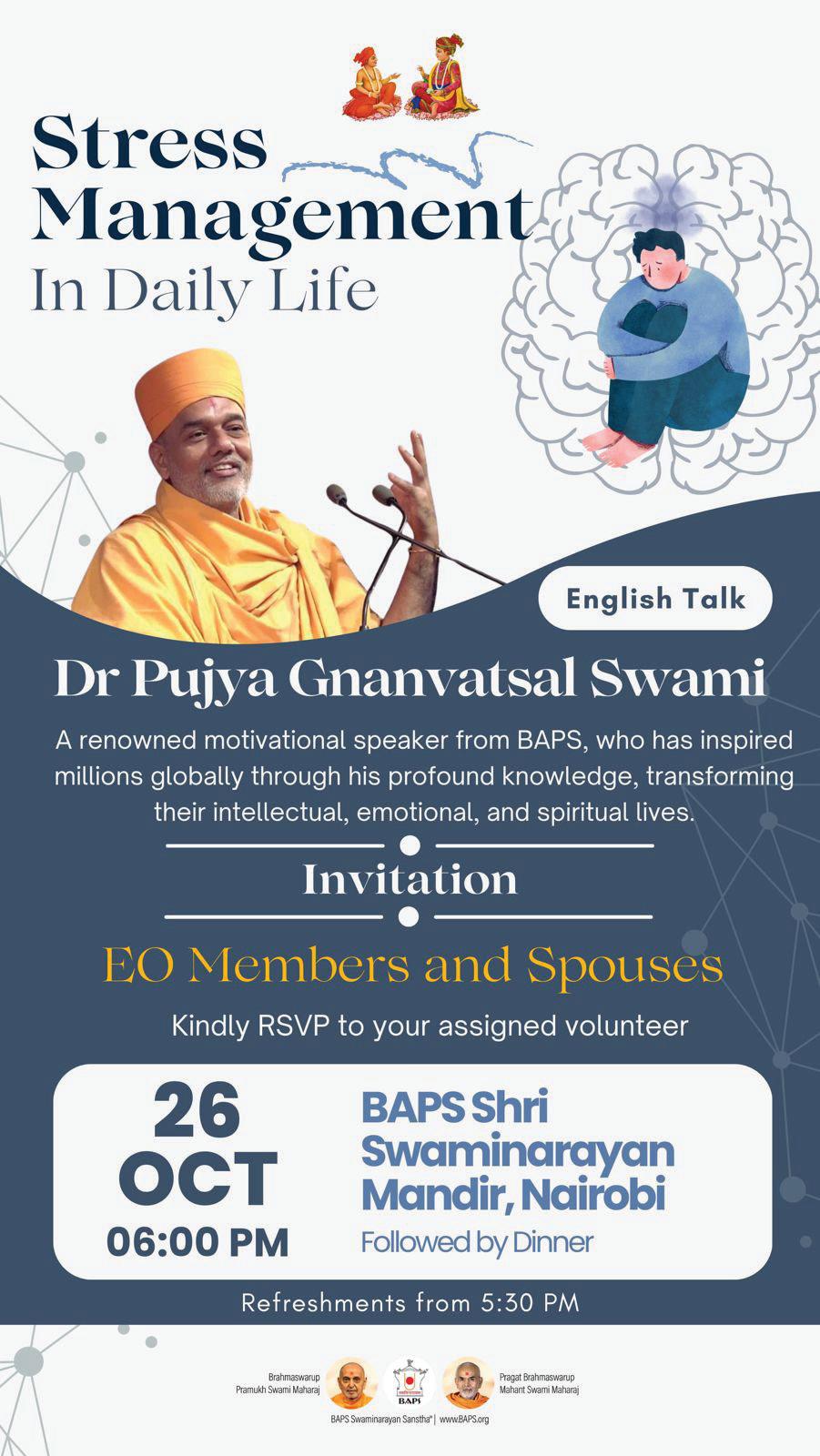 EO members and SLPs are cordially invited to a talk given by the eminent BAPS speaker Dr Pujya Gnanvatsal Swami on 26th October at 6pm at BAPS Shri Swaminarayan Mandir, Nairobi.