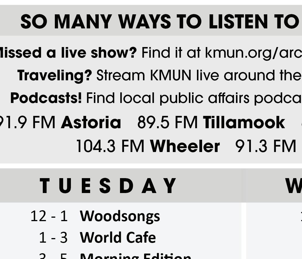 KMUN, or Coast Community Radio, which includes KMUN 91.9 FM (Astoria), KTCB 89.5 FM (Tillamook) and 90.9 FM (Warrenton), is the only non-commercial community station serving coastal communities in Northwest Oregon and Southwest Washington — and on April 22 we’re marking 40 years on the air!
