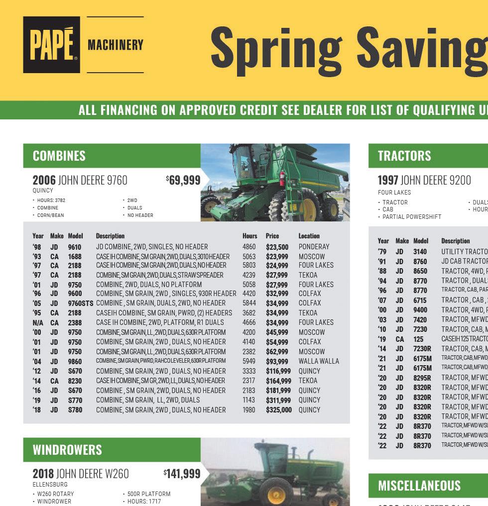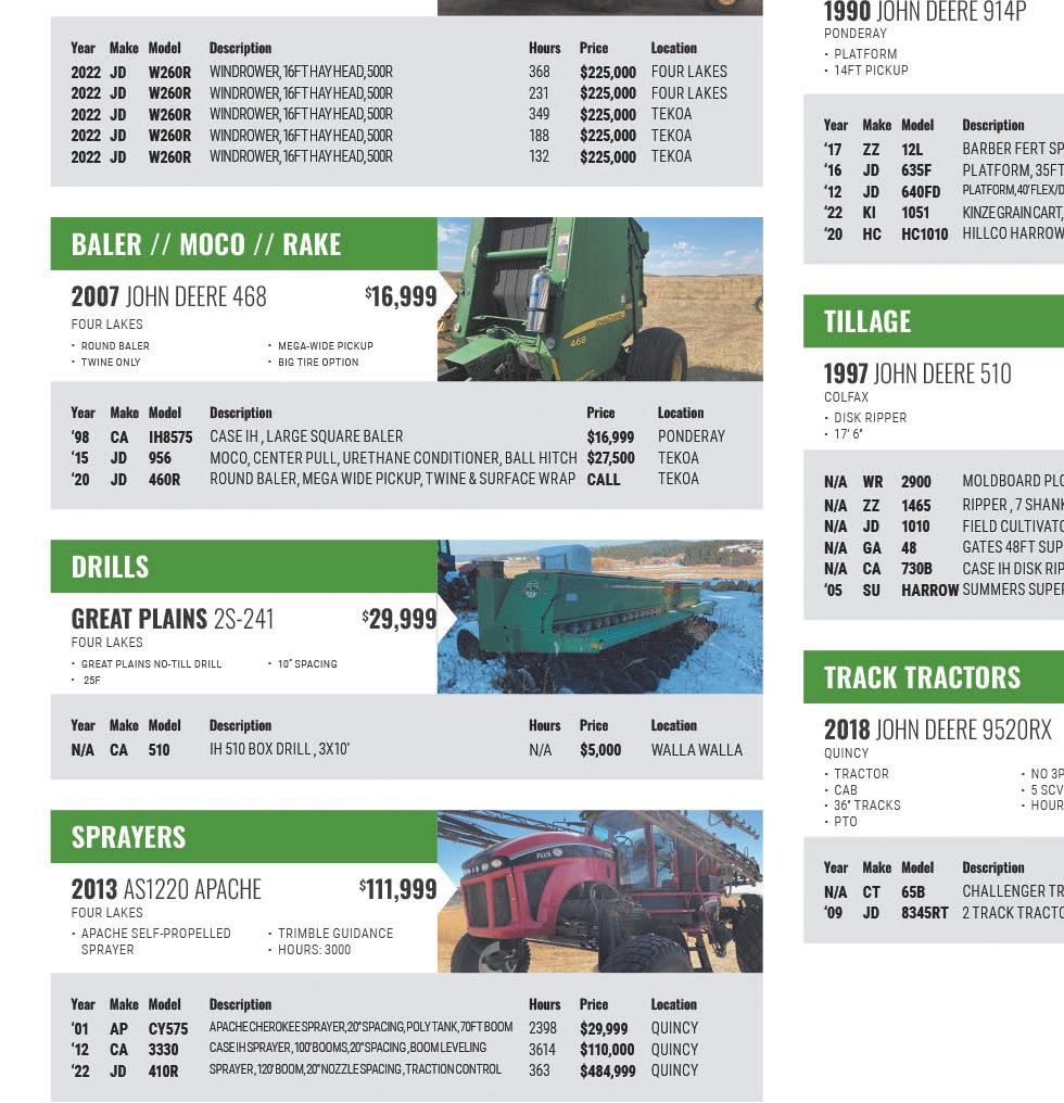 9870’s Starting.................. @ $150,000 Call while inventory lasts! ‘13 CASE IH 500 QUAD TRAC, 5190 hours $230,000 BRAND NEW JD 17G MINI EXCAVATOR 2023 CALL FOR PRICE JD 946, MoCos CALL NEW HAY JD 4400 TRACTOR W/ 420 LOADER $15,750 NEW MACDON FD75 DRAPER HEADER $68,000