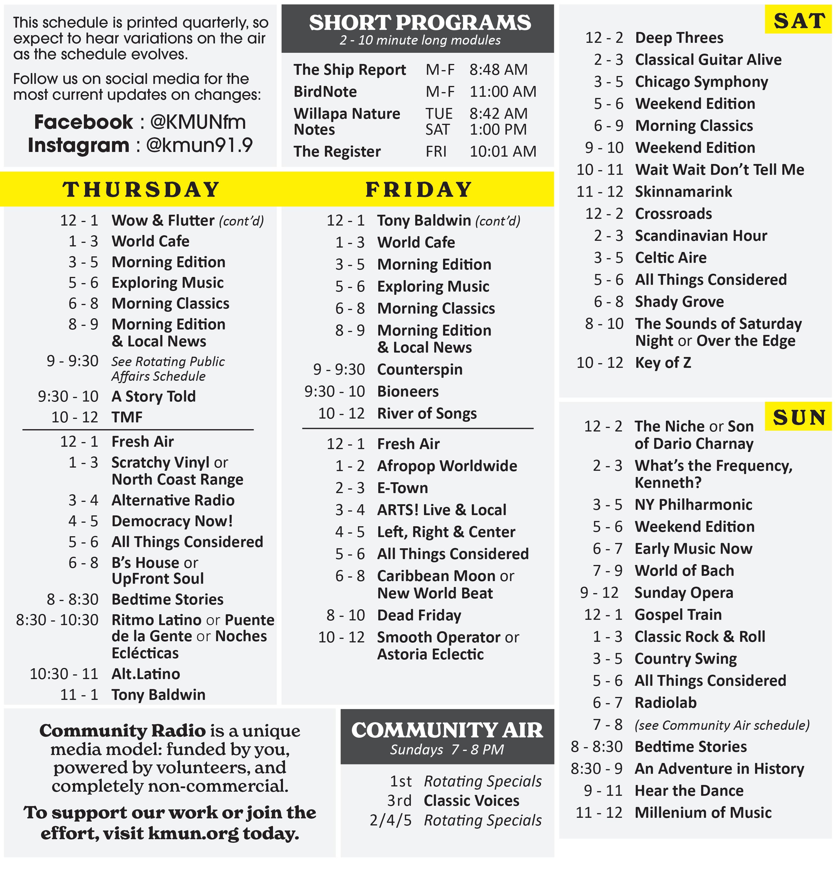 Everyone is welcome to tune into our educational based programming with myriad public affairs shows, local news and weather. Everyone is invited to have a show on KMUN! We all have something to
