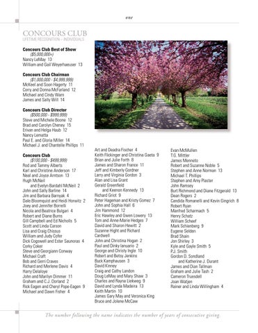 Concours Club Best of Show ($5,000,000+) Nancy LeMay 13 William and Gail Weyerhaeuser 13 Concours Club Chairman ($1,000,000 - $4,999,999) McKeel and Soon Hagerty 11 Corry and Donna McFarland 12 Michael and Cindy Warn James and Sally Will 14 Concours Club Director ($500,000 - $999,999) Steve and Michele Boone 12 Brad and Carolyn Cheney 15 Erivan and Helga Haub 12 Nancy Lematta Paul E. and Gloria Miller 14 Michael J. and Chantelle Phillips 11 Concours Club ($100,000 - $499,999) Rod and Tammy Alberts Karl and Christine Anderson 17 Neal and Joyce Arntson 13 Hugh McNeil and Evelyn Bardahl McNeil 2 John and Sally Barline 14 Jim and Barbara Barnyak 4 Dale Bloomquist and Heidi Horwitz 2 Joey and Jennifer Borrelli Nicola and Beatrice Bulgari 4 Robert and Diane Burns Gill Campbell and Ed Nicholls 5 Scott and Linda Carson Lisa and Craig Chissus William and Judy Cofer Dick Cogswell and Ester Saunoras 4 Corky Coker Steve and Georgiann Conway Michael Craft Bob and Gerri Craves Richard and Merlene Davis 4 Harry Delaloye John and Marilyn Dimmer 11 Graham and C.J. Dorland 2 Rick Eagen and Cheryl Pope-Eagen 9 Michael and Dawn Fisher 4