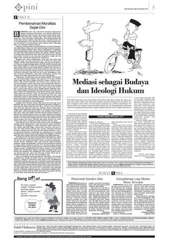 ta secara damai yang tepat, efektif, dan dapat membuka akses yang lebih luas kepada Para Pihak untuk memperoleh penyelesaian yang memuaskan serta berkeadilan. Mediasi juga dimaksudkan agar suatu sengketa di pengadilan dapat dilakukan secara sederhana, cepat dan berbiaya ringan. Dalam proses mediasi tidak mengedepankan bukti-bukti atau bicara hukum, melainkan kepentingan bersama serta perasaan para pihak. Indonesia sebagai negara hukum dalam kehidupan bermasyarakat, berbangsa dan bernegara, penyelesaian sengketa tentu bertindak sesuai dengan hukum. Akan tetapi sistem hukum di Indonesia berbeda dengan Negara hukum Eropa Kontinental seperti Belanda atau Negara hukum Anglo Saxon seperti Amerika Serikat, sistem hukum di Indonesia menganut Negara hukum Pancasila. Jadi didalam upaya penyelesaian sengketa seharusnya masyarakat mengedepankan caracara yang berbudaya dan cara sesuai ideologi bersama yaitu musyawarah untuk mufakat guna menghadirkan harmoni dalam persaudaraan. *Penulis, calon Mediator Indonesian Institute for Conflict Transformation