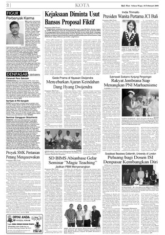 Kejaksaan Diminta Usut Bansos Proposal Fiktif Denpasar (Bali Post) Pengelolaan sejumlah bantuan sosial (bansos) yang dikelola oknum anggota DPRD ditengarai banyak menggunakan administrasi dan proposal fiktif. Pertanggungjawaban bansos pun sering dikelola secara diam-diam, sehingga realisasi bansos tak sampai kepada sasaran. Kejaksaan dan inspektorat wilayah diminta mengusut dan membuka kepada publik pelaku pencairan bansos yang dilakukan tanpa didasari prosedur yang benar. Ketua LSM Jaringan Informasi Kerja Alternatif (JIKA) Ngurah Karyadi, Senin (9/2) kemarin menengarai administrasi fiktif pengelolaan bansos dan dana bencana ini juga ditengarai melibatkan eksekutif untuk kepentingan konstituen politiknya. ‘’Bansos sering menjadi dana talangan untuk membayar janji kampanye. Ini bentuk-bentuk pembodohan publik. Manipulasi bansos baru sebagian kecil yang muncul ke permukaan dan disikapi dengan penegakan hukum,’’ kritiknya. Pihaknya mengaku kini banyak mendapat pengaduan dari caleg-caleg muda yang mengaku lawan politiknya sering mengklaim bansos sebagai sumbangan politik. Caleg muda yang tak
