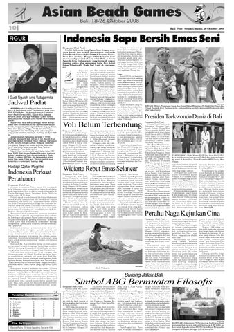 Voli Belum Terbendung Denpasar (Bali Post) Tim bola voli putra dan putri Indonesia melangkah mulus ke babak berikutnya setelah mencatat kemenangan pada hari kedua Asian Beach Games (ABG) I/2008 di Sanur, Denpasar, Minggu (19/10) kemarin. Tim putra-putri Indonesia 1 dan 2 terus melaju dengan mengalahkan lawan-lawannya. Tim putra Indonesia 1 yang diperkuat Ardiansyah/ Darkucoro tidak terlalu sulit untuk mengalahkan tim India 1 (Poothathan/Pradeep) dengan skor 2-0 (21-11, 21-15).