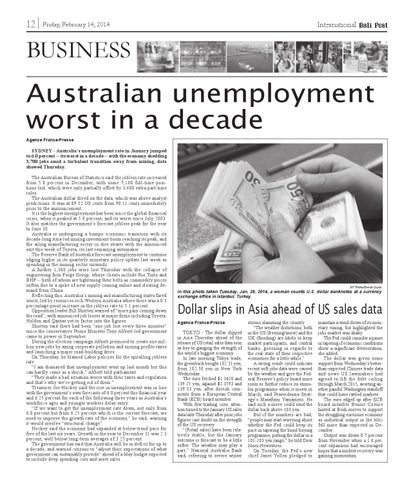 SYDNEY - Australia’s unemployment rate in January jumped to 6.0 percent -- its worst in a decade -- with the economy shedding 3,700 jobs amid a turbulent transition away from mining, data showed Thursday. The Australian Bureau of Statistics said the jobless rate increased from 5.8 percent in December, with some 7,100 full-time positions lost, which were only partially offset by 3,400 extra part-time roles. The Australian dollar dived on the data, which was above analyst predictions. It was at 89.52 US cents from 90.11 cents immediately prior to the announcement. It is the highest unemployment has been since the global financial crisis, when it peaked at 5.8 percent, and its worst since July 2003. It also matches the government’s forecast jobless peak for the year to June 30. Australia is undergoing a bumpy economic transition with its decade-long Asia-led mining investment boom reaching its peak, and the ailing manufacturing sector in dire straits with the announced exit this week of Toyota, its last remaining automaker. The Reserve Bank of Australia forecast unemployment to continue edging higher in its quarterly monetary policy update last week as spending in the mining sector unwinds. A further 1,300 jobs were lost Thursday with the collapse of engineering firm Forge Group, whose clients include Rio Tinto and BHP -- both of whom are tightening their belts as commodity prices soften due to a spike of new supply coming online and slowing demand from China. Reflecting this, Australia’s mining and manufacturing states fared worst, led by resources-rich Western Australia where there was a 0.5 percentage point increase in the jobless rate to 5.1 percent. Opposition leader Bill Shorten warned of “more pain coming down the road”, with announced job losses at major firms including Toyota, Holden and Qantas yet to factor into the figures. Shorten said there had been “one job lost every three minutes” since the conservative Prime Minister Tony Abbott-led government came to power in September. During the election campaign Abbott promised to create one million new jobs by axing corporate pollution and mining profits taxes and launching a major road-building drive. On Thursday, he blamed Labor policies for the spiralling jobless rate. “I am dismayed that unemployment went up last month but this can hardly come as a shock,” Abbott told parliament. “They made a bad situation worse with their taxes and regulation and that’s why we’re getting rid of them.” Treasurer Joe Hockey said the rise in unemployment was in line with the government’s own forecasts of 6.0 percent this financial year and 6.25 percent for each of the following three years as Australia’s workforce ages and younger workers delay entry. “If we want to get the unemployment rate down, not only from 6.0 percent but from 6.25 percent which is the current forecast, we need to improve the growth rate of the economy,” he said, warning it would involve “structural change”. Hockey said the economy had expanded at below-trend pace for five of the last six years. Growth in the year to December 31 was 2.3 percent, well below long-term averages of 3.25 percent. The government has said that Australia will be in deficit for up to a decade, and warned citizens to “adjust their expectations of what government can sustainably provide” ahead of a May budget expected to include deep spending cuts and asset sales.