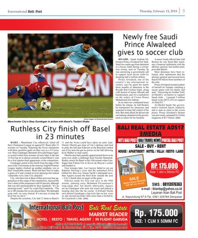 11 and the Swiss could have taken an early lead. Dimitri Oberlin got clear of City’s defence and tried to poke the ball past Ederson as the Brazilian rushed out of his area but got no power on the ball allowing Kyle Walker to clear easily. Oberlin also had a penalty appeal turned down as he went over under a challenge from Nicolas Otamendi. Reality struck for Basel in the 14th minute when Gundogan beat Fabian Frei to Kevin de Bruyne’s corner and headed in. Four minutes later, Leo Lacroix failed to cut out Raheem Sterling’s cross and the unmarked Silva lobbed his shot over Tomas Vaclik’s attempted save, then Aguero scored the third from outside the area -- City’s fourth shot on target of the game. Ederson made his first real save in the 49th minute, palming away Mohamed Elyounoussi’s long-range shot, but shortly afterwards, Aguero set up Gundogan who took one touch and placed a looping shot into the far corner. A brilliant Vaclik save denied Gundogan a hat-trick late on but, even so, the second leg looks little more than a formality for Guardiola’s side. (rtr)