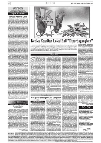 Oleh I Wayan Dibia erbagai fenomena yang terlihat di masyarakat mengindikasikan bahwa nilai-nilai kearifan lokal Bali sudah mulai ‘’dijual’’ oleh para tokoh masyarakat dan para pemimpin Bali sendiri. Dikatakan dijual, karena nilai-nilai luhur yang selama ini menjadi pegangan hidup, pengukuh jati diri dan budaya orang Bali, sudah digadaikan dan dimanfaatkan sedemikian rupa untuk mendapatkan keuntungan uang dan material lainnya. Nilai-nilai yang pada masa lampau dipegang kuat oleh para leluhur Bali, akhir-akhir ini telah dijadikan bahan jualan untuk mengais keuntungan oleh sekelompok orang tertentu yang lagi berkuasa. Dengan dalih untuk menyejahterakan masyarakat, namun sesungguhnya cara-cara seperti itu untuk memperoleh keuntungan diri sendiri. Kita sering terlena dan terpukau menyaksikan banyak tokoh dan pemimpin di daerah ini yang sangat fasih menjelaskan makna Tri Hita Karana dan Tri Kaya Parisuda. Banyak orang yang jago menuangkan prinsip-prinsipnya ke dalam sederetan kalimat ke dalam proposalproposal proyek besar untuk meyakinkan pihak penyandang dana. Selain mampu membius banyak orang, semuanya ini berhasil meyakinkan publik bahwa orang yang berpidato atau penulis proposal adalah para tokoh dan pakar yang pantas untuk dijadikan tameng pertahanan nilainilai kearifan lokal Bali. Namun dalam realitasnya sering kali justru terbalik. Nilai-nilai kearifan lokal yang biasa mereka pidatokan itu hanyalah bualan kosong untuk pencitraan, karena mereka sendiri tidak menjalankan prinsip-prinsip Tri Hita