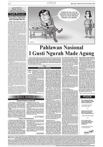 POJOK Tim Sembilan diminta tetap menjadikan Teluk Benoa kawasan suci. - Aneh kalau kawasan suci berubah-ubah. *** Kepala daerah minta naik gaji, Mendagri minta tunjukkan kerja. - Artinya, kerja dulu baru gaji. *** 10 November hari ini, bangsa Indonesia memperingati Hari Pahlawan. - Sekarang lawan korupsi, bukan penjajah.