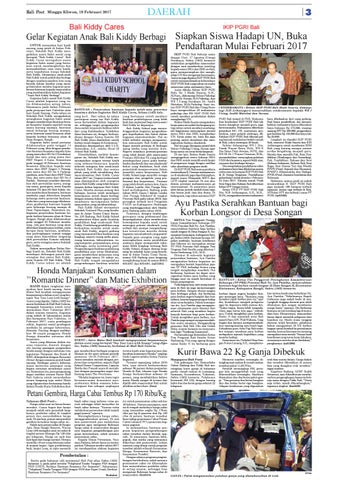 BANTUAN - Penyerahan bantuan kepada salah satu penerima beasiswa dalam kegiatan Bali Kiddy Cares, Selasa (14/2) lalu. yang ke-5. Dari tahun ke tahun yang bertujuan untuk memberi partisipasi orang tua Bali Kiddy fasilitas pembelajaran yang lebih terus bertambah dalam kegiatan baik dan maksimal bagi siswa-siswi ini, sehingga target pengumpulan Bali Kiddy ke depannya. dana sudah terpenuhi bahkan lebih Bali Kiddy School juga menyedari yang dialokasikan. Kelebihan lenggarakan kegiatan pengembandana bantuan ini, dengan berkoor- gan kepribadian dan bakat dalam dinasi dengan Ketua Komite SD kegiatan ekstrakurikuler. Hal ini Bali Kiddy akan disalurkan untuk telah terbukti mampu mengantarkorban tanah longsor di Kintamani,” kan siswa-siswi Bali Kiddy untuk demikian disampaikan oleh I.A.K. dapat meraih prestasi di berbagai Suwardani, S.S., selaku Head Of ajang lomba yang mereka ikuti. School Bali Kiddy. Seperti misalnya prestasi-prestasi Ditambahkan, melalui kesem- yang telah diraih oleh siswa-siswi patan ini, Sekolah Bali Kiddy me- Primary (SD) dan TK yang berhasil nyampaikan ucapan terima kasih mendapatkan juara pada lombayang sebesar-besarnya kepada lomba akademik dan non akademik/ seluruh orangtua dan anak-anak bakat yang diadakan, baik oleh Sekolah Bali Kiddy dan semua pemerintah maupun swasta. Selain pihak yang telah mendukung dan memiliki siswa berprestasi, Bali menyukseskan Bali Kiddy Cares Kiddy School juga memiliki tenaga tahun 2017 ini. Ucapan terima kasih pengajar dan pengelola yang projuga disampaikan oleh orangtua fesional dan berprestasi. Prestasi siswa Bali Kiddy yang telah berpar- yang telah diraih antara lain, Juara tisipasi dalam kegiatan Bali Kiddy II dalam Lomba Alat Peraga EduCares. Mereka merasa senang dan katif se-Kabupaten Badung pada bahagia, karena telah mendapat tahun 2015, Juara I dalam Lomba kesempatan untuk dapat berbagi Alat Peraga Edukatif di tingkat dengan sesama dalam upaya untuk Provinsi Bali pada tahun 2016, dan membantu meringankan beban peringkat terbaik ke-2 Pengelola masyarakat yang membutuhkan. PAUD se-Kabupaten Badungm Bali Kiddy School merupakan yang diselenggarakan oleh DisdikSekolah National Plus yang berala- pora Badung pada tahun 2016. mat di Jalan Teuku Umar Barat, Tentunya, dengan bimbingan No. 235 Badung. Bali Kiddy School guru-guru yang professional dan memberikan fokus pada kualitas berpengalaman akan memberikan pendidikan bagi anak-anak Bali kesempatan kepada anak untuk Kiddy. Pendukung pendidikan yang mencapai potensi akademik yang berkualitas tersedia untuk anak- terbaik dan mampu mengembanganak Bali Kiddy, seperti gedung kan kreativitas mereka dalam yang representatif dan fasilitas yang kegiatan non-akademik yang positif. lengkap, seperti ruang serba guna, Kepada para orangtua yang ingin ruang kesenian, laboratorium, ru- meningkatkan mutu pendidikan ang komputer, perpustakaan, arena anaknya dapat memperoleh inforolahraga, serta swimming pool. masi lebih lengkap tentang Bali Pengembangan fasilitas pendukung Kiddy School, dengan datang langpendidikan pun terus dilakukan, sung ke sekolah kami yang beralaguna memberikan pelayanan yang mat di Jalan Teuku Umar Barat, optimal bagi siswa. Di tahun ini, nomor 235 Badung atau langsung Bali Kiddy tengah mengadakan menghubungi kami di nomor (0361) pengembangan fasilitas sekolah 8954957 dan 8954991. (ad1591)