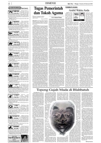 Tugas Pemerintah dan Tokoh Agama Brahmane brahmanam, ksatriya rajanyam, marudbhyo vaisyam tapase sudram. (Yajurveda XXX.5) Maksudnya: Ya Tuhan telah menciptakan Brahmana untuk pengetahuan. Ksatria untuk perlindungan, Waisya untuk kesejahteraan ekonomi dan Sudra untuk pekerjaan jasmani. HUBUNGAN tokoh agama dan pejabat pemerintah menurut pandangan Hindu bagaikan hubungan antara Ksatriya Varna dengan Brahmana Varna. Menurut kekawin Ramayana hubungan antara Brahmana dan Ksatriya dinyatakan dalam bahasa Jawa Kuno dengan istilah ‘’jatinia padulur’’ maksudnya: harusnya searah dalam swadharma yang berbeda tetapi saling melengkapi. Manawa Dharmasastra I.89 menyatakan Ksatriya Varna itu wajib mengupayakan terwujudnya kehidupan masyarakat yang aman damai dan sejahtera (Prajanam Raksanam Daanam). Kalau ada program-program pemerintah (Ksatriya) tersebut yang belum berhasil bahkan ada yang gagal atau ada yang belum sempat dilaksanakan karena berbagai keterbatasan. Hal itu tentunya kurang tepat kalau kaum Brahmana Varna (tokoh agama) menuduh para Ksatriya Varna berbohong. Sebaliknya kalau ada sementara umat beragama melakukan tindakan kekerasan yang anarkhis mengatasnamakan agama yang dianutnya dan terjadinya kebobrokan moral dan kelemahan mental dalam berbagai bidang kehidupan, tentunya kurang tepat pula kalau para Ksatriya Varna di pemerintahan menuduh tokoh agama (Brahmana Varna) yang berbohong. Karena mendidik dan mengarahkan umat menjadi umat yang lembut dan tidak anarkis serta bermoral yang luhur menjadi tugas utama tokoh agama. Membangun kebaikan publik dalam kehidupan bersama akan berhasil apabila ada keseimbangan antara kepemimpinan yang benar dan baik serta dibarengi dengan kepengikutan yang benar dan baik pula. Kepemimpinan dan kepengikutan yang benar dan baik dibangun dengan cara demokratis dengan pertimbangan akal sehat dan kesadaran hati nurani bersih dan tulus. Membangun kebaikan publik dengan saling menyalahkan tentunya amat tidak produktif. Membangun kebaikan publik itu merupakan tanggung jawab bersama. Adanya dialog antara tokoh-tokoh agama dengan pemerintah di Indonesia baru-baru ini sesuatu yang seyogyanya disyukuri. Karena lewat dialog itu dapat mencegah adanya proses saling menyalahkan dapat disalurkan ke dialog positif untuk saling memahami tanggung jawab masing-masing dalam membangun kebaikan publik dengan bangsa. Semoga dialog tersebut berlangsung terus tahap demi tahap, sehingga setiap persoalan bangsa dapat diatasi tahap demi tahap. Persoalan akan semakin membesar kalau semua pihak saling menyalahkan. Semua pihak memiliki kelebihan dan kekurangannya masing-masing. Waktu, tenaga dan biaya akan habis untuk saling menyalahkan. Kita bisa lupa akan swadharma masing-masing untuk kebaikan bersama. Untuk membangun kehidupan yang adil, aman, damai dan sejahtera dibutuhkan berbagai profesi. Mantra Yajurveda XXX.5 menyatakan Tuhan telah menciptakan empat profesi yang disebut Catur Varna