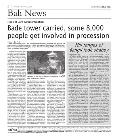 Founder : K.Nadha, General Manager :Palgunadi Chief Editor: Diah Dewi Juniarti Editors: Gugiek Savindra,Alit Susrini, Alit Sumertha, Daniel Fajry, Mawa, Sri Hartini, Suana, Sueca, Sugiartha, Yudi Winanto Denpasar: Dira Arsana, Giriana Saputra, Subrata, Sumatika, Asmara Putra. Bangli: Pujawan, Buleleng: Adnyana, Gianyar: Agung Dharmada, Karangasem: Budana, Klungkung: Bali Putra Ariawan. Jakarta: Nikson, Hardianto, Ade Irawan. NTB: Agus Talino, Izzul Khairi, Raka Akriyani. Surabaya: Bambang Wilianto. Development: Alit Purnata, Mas Ruscitadewi. Office: Jalan Kepundung 67 A Denpasar 80232. Telephone (0361)225764, Facsimile: 227418, P.O.Box: 3010 Denpasar 80001. Bali Post Jakarta, Advertizing: Jl.Palmerah Barat 21F. Telp 021-5357602, Facsimile: 021-5357605 Jakarta Pusat. NTB: Jalam Bangau No. 15 Cakranegara Telp. (0370) 639543, Facsimile: (0370) 628257. Publisher: PT Bali Post