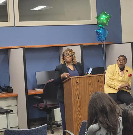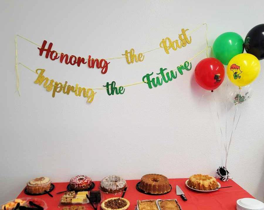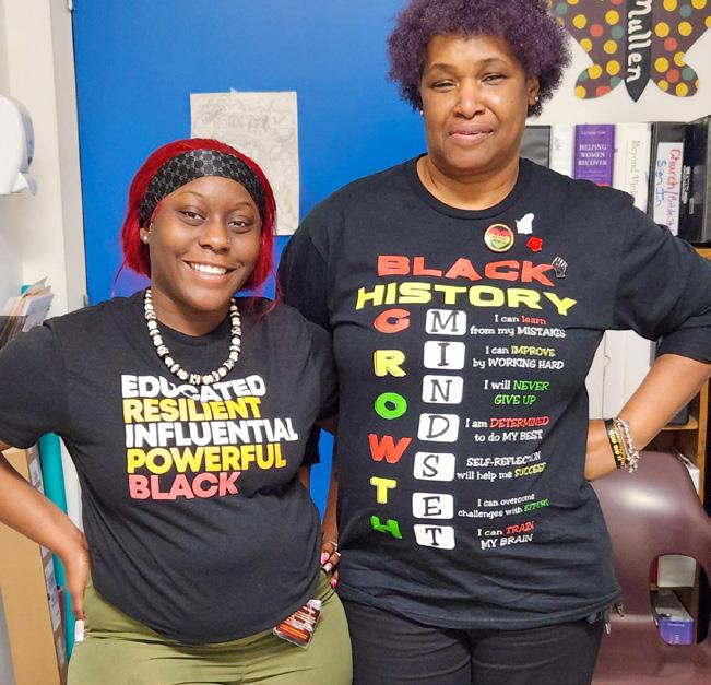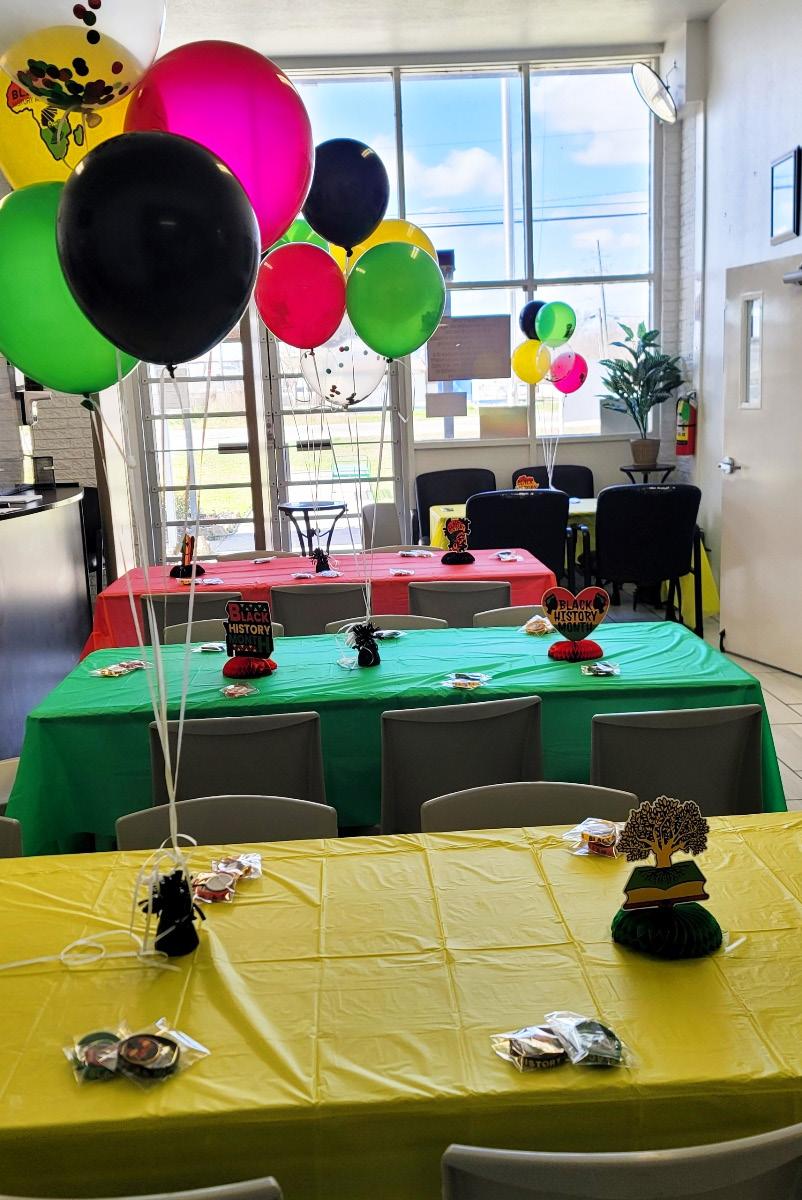 Each February, employees at the Southeast Texas Transitional Center (STTC) celebrate Black History Month through educational, cultural, and social activities. This year, a committee of volunteers began meeting in January and planned all related activities. Led by Chairperson Melonye Singleton, the committee ordered pins, wristbands, and key chains for distribution at the luncheon. The potluck meal featured African American and cultural dishes, which were either catered or prepared by employees. Decorations included dozens of posters throughout the administration building that shared information on black individuals who made positive and notable historical and cultural contributions to society in the fields of politics and education. Additionally, doors were decorated with scenes which depicted important events and achievements regarding Black History. The event was highlighted by several African-American employees (Monique Davis, BraShanna Hafford, Shyria Joseph, Nedra Miller) who displayed personal artwork or information related to their personal non-profit organizations which all benefit the black community.