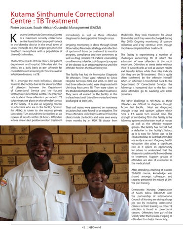Modimolle. They took treatment for about 28 months until they were discharged during May 2010. Ongoing monitoring of sputum collection and x-ray continue even though they have completed their treatment. The facility is experiencing a number of challenges concerning TB of which the admission of new offenders it the most important. Offenders at times arrive without their TB patient cards as well as sputum results and transfer letters while their files indicate that they are on TB treatment. This is quite often confirmed by the offender himself. When an offender is transferred back to the Department Of Correctional Services the follow-up is hampered due to the fact that some offenders go to Gauteng and other provinces. The other challenge is HIV/AIDS, as these offenders are difficult to diagnose through Active Fast Bacilla. Most are diagnosed through x-rays and sputum culture which have a 4-6 weeks turn around time. The strength of combating TB in this facility is the follow up system and the team work of nurses as well as the offender support groups. The facility has not yet had a defaulter in the facility’s history, as it is easy for follow ups to be conducted due to fact that offenders are easily accessed. Ongoing health education also plays a significant role as it opens an opportunity for others to understand that the disease is curable only if one adheres to treatment. Support groups of offenders are also of assistance to the medical staff. After attending a training of trainers TB/MDR course, knowledge was shared amongst colleagues and security personnel by means of Onthe-Job training. Democratic Nursing Organisation of South Africa (DENOSA) with the partnership of International Council of Nursing are doing a huge job too by including correctional centres in their training as more TB infection is found in correctional centres. Offenders form part of the society after their release. Helping of offenders thus helps the society.