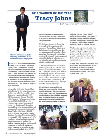 n June 2012, Tracy Johns was appointed Warden of D. Ray James Correctional Facility (DRJCF) in Folkston, Georgia. Previously, he had a distinguished 28-year career with the Federal Bureau of Prisons (BOP). During his tenure with the BOP, he served in various capacities starting as a Correctional Officer and working his way up the ranks to include an appointment as Correctional Services Administrator in Washington, D.C. and Warden of three different institutions. In September 2013 under Warden Johns’ leadership, the D. Ray James Correctional Facility received its first award fee since the contract began based on the BOP Self-Assessment evaluation. The 20122013 Contractor Performance Assessment Period (CPAR) for DRJCF revealed continued improvement in every rated category by the client and validated the sustained level of performance with regard to contractual requirements. Additionally, during Warden Johns’ tenure, DRJCF received its initial accreditation from the American Correctional Association (ACA) on January 23, 2013, with a score of 100% compliance with all applicable standards with high comments from the ACA Auditors regarding excellent sanitation and competence of staff, with special noteworthy comments in areas of programs, food service and medical. Also, DRJCF