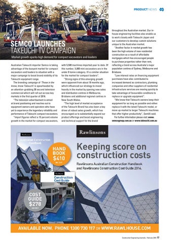 throughout the Australian market. Our inhouse engineering facilities also enable us to work closely with Takeuchi Japan and our customers to develop custom solutions unique to the Australian market. “Another factor in market growth has been the high volume of new residential construction as a result of affordable mortgages which has encouraged people to purchase properties rather than rent, reflecting a trend across Australia’s major population centres of Sydney, Melbourne and Brisbane. “Low interest rates on financing equipment purchases have also contributed to increased demand as contractors, plumbing companies and other suppliers of residential infrastructure services are moving quickly to take advantage of favourable conditions to replace or upgrade equipment”. “We know that Takeuchi owners keep their equipment for as long as possible and either replace it with the latest Takeuchi model, or move up-market to larger Takeuchi machines that offer higher productivity”, Santilli said. For further information please visit: www. semcogroup.com.au or www.takeuchi.com.au