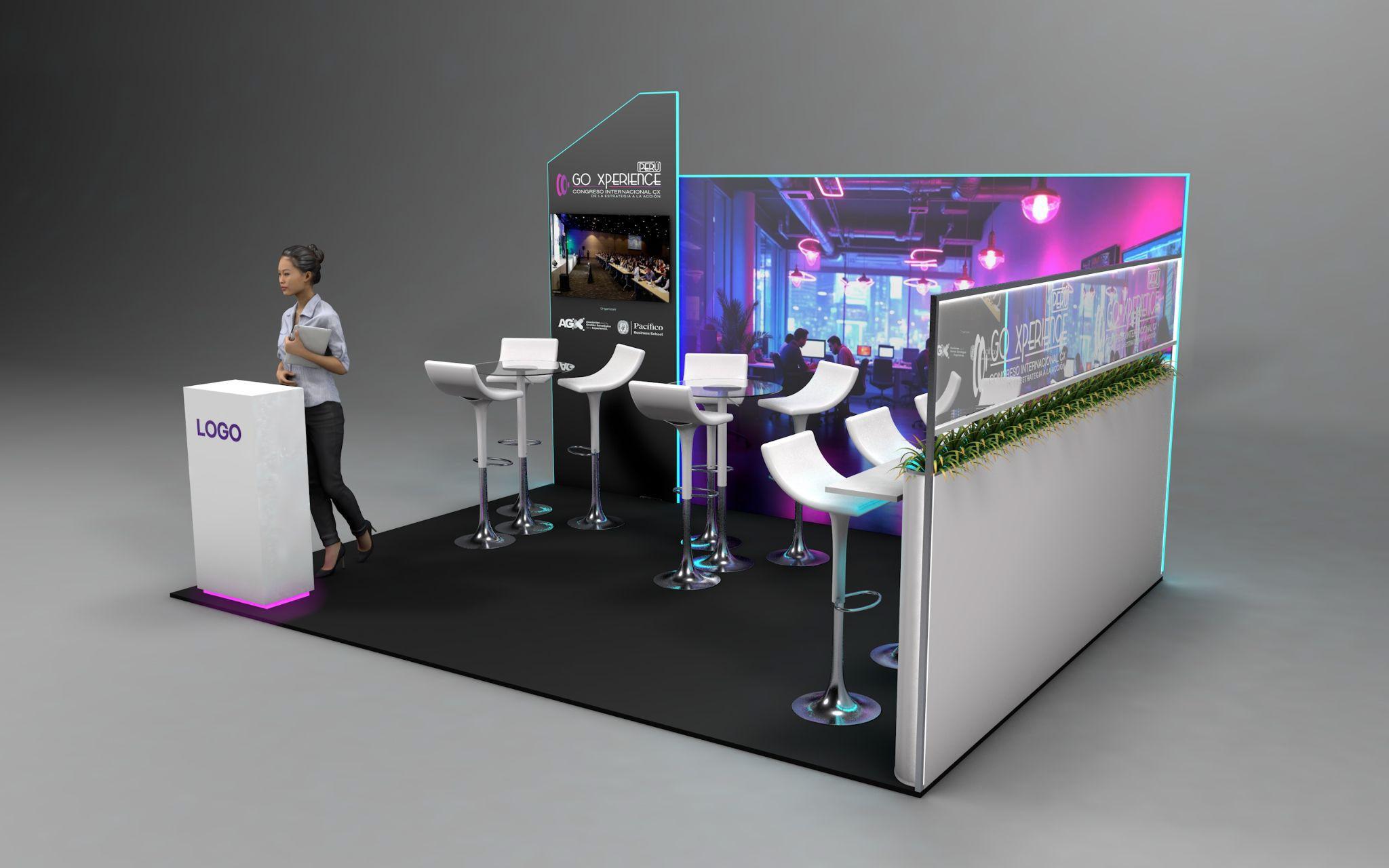 Stand Tipo B: Stand de 3x2m en MDF con tira led y backing con banner. TV 43". Módulo de 0.50m de ancho x 1.20m de alto y tomacorriente. Tapizón. Mesa con dos sillas. Silla alta para módulo. 2 entradas de cortesía.