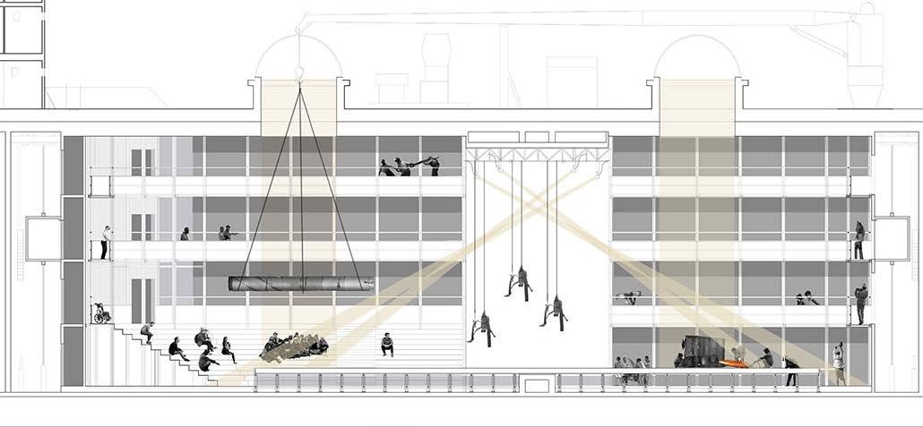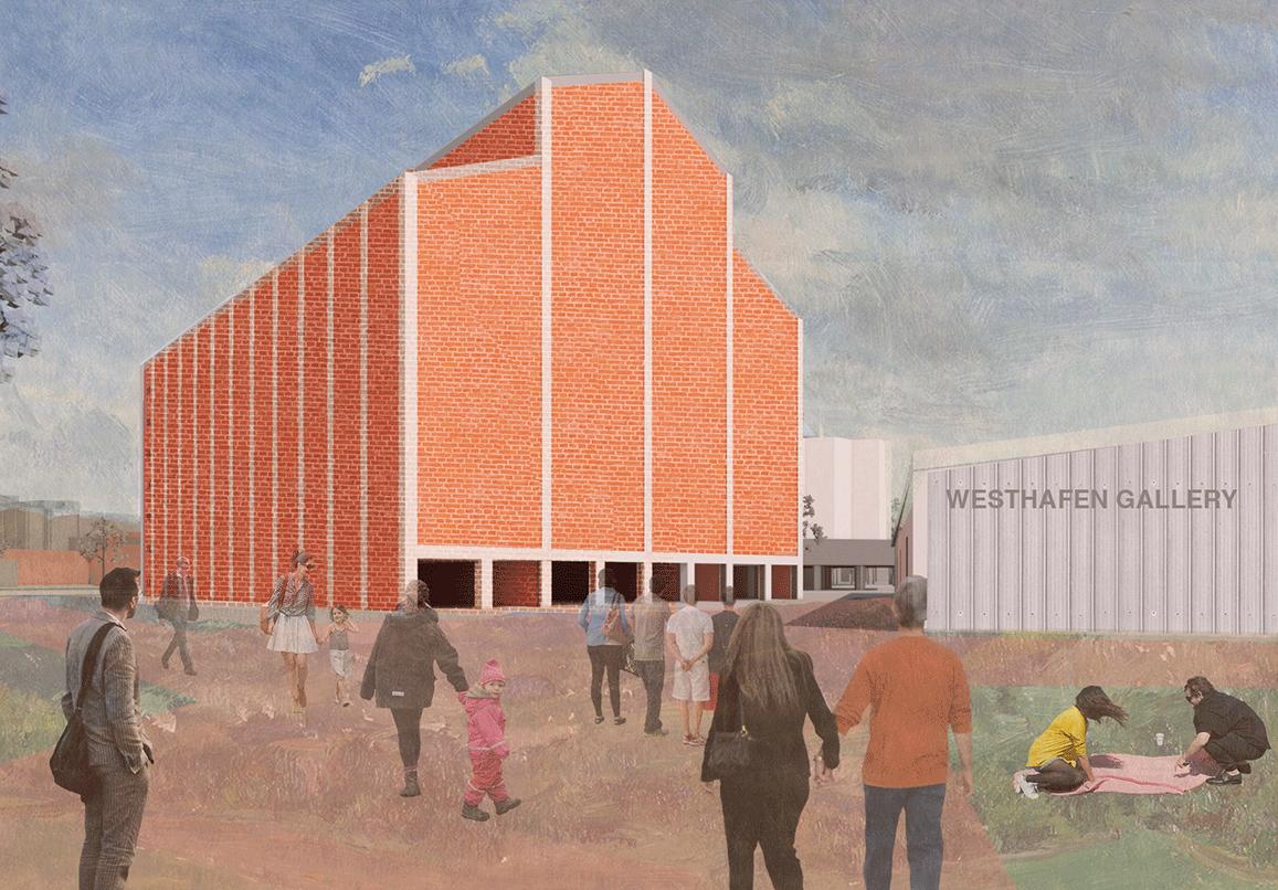 A project designed to redevelop the existing industrial port area of Westhafen through the introduction of cultural facilities accessed by new pedestrian and cycling routes. The proposal seeks to alter the use of key buildings on the site of Westhafen Port, Moabit, Berlin. Crucially interventions concern the existing cement factory as the key exhibition space of a future gallery and the intervening spaces as sculpture courts and walkways. These targeted moves allow the industrial functions of the site to be maintained whilst cultural users are protected. Connectivity with existing green spaces to the North and future greening of the road and path networks elevate the joy of being in the area and moving through it as well as further bringing the people closer to the river which presently remains distant from citylife. The community and Spree-side has suffered from entrepeneurial planning (Mediaspree) and been witness to protests demanding community involvement and interest in, making these areas public good. Renders created using Revit and Photoshop, arrangements editted in Illustrator and presented in InDesign. AutoCAD 2D and Rhino site drawings remodelled from Berlin Geoportal.