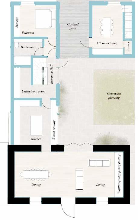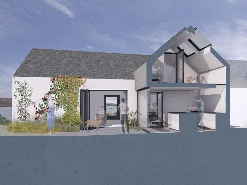 These images were produced for an initial design consultation. The proposal sought to extend and alter an existing traditional Hebridean style cottage into a family home. Key constraints were keeping the new accommodation within the existing footprint of disused out buildings and discrete enough to not detract from the historic character of the cottage. I was involved in the final stages of modelling and rendering in ArchiCAD as well as drawing up the plans and editing the renders of all of the images in Photoshop.