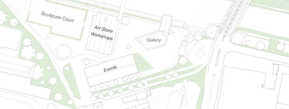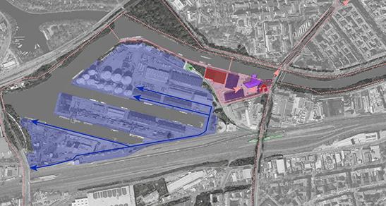 The site lays orphaned by its rail and road network to the South and the River Spree to the Nor th as such in order to bring pedestrians and cyclist to the area it is impor tant to improve existing communications as well as introduce new routes. A new path following the historic rail lines has been established with a bridge to the Island and to the Nor ther n side. It is intended that the path networks join also beneath the main road bridge. All industrial works should be buffered by a layer of appropriate tree planting,