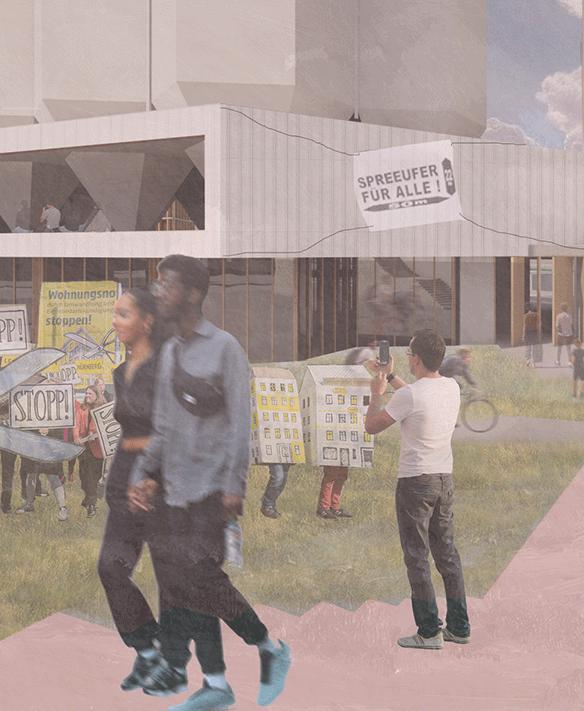 4. Render Collage, Perspective, entrance to public space and opportunity to assemble for rights of Spree.