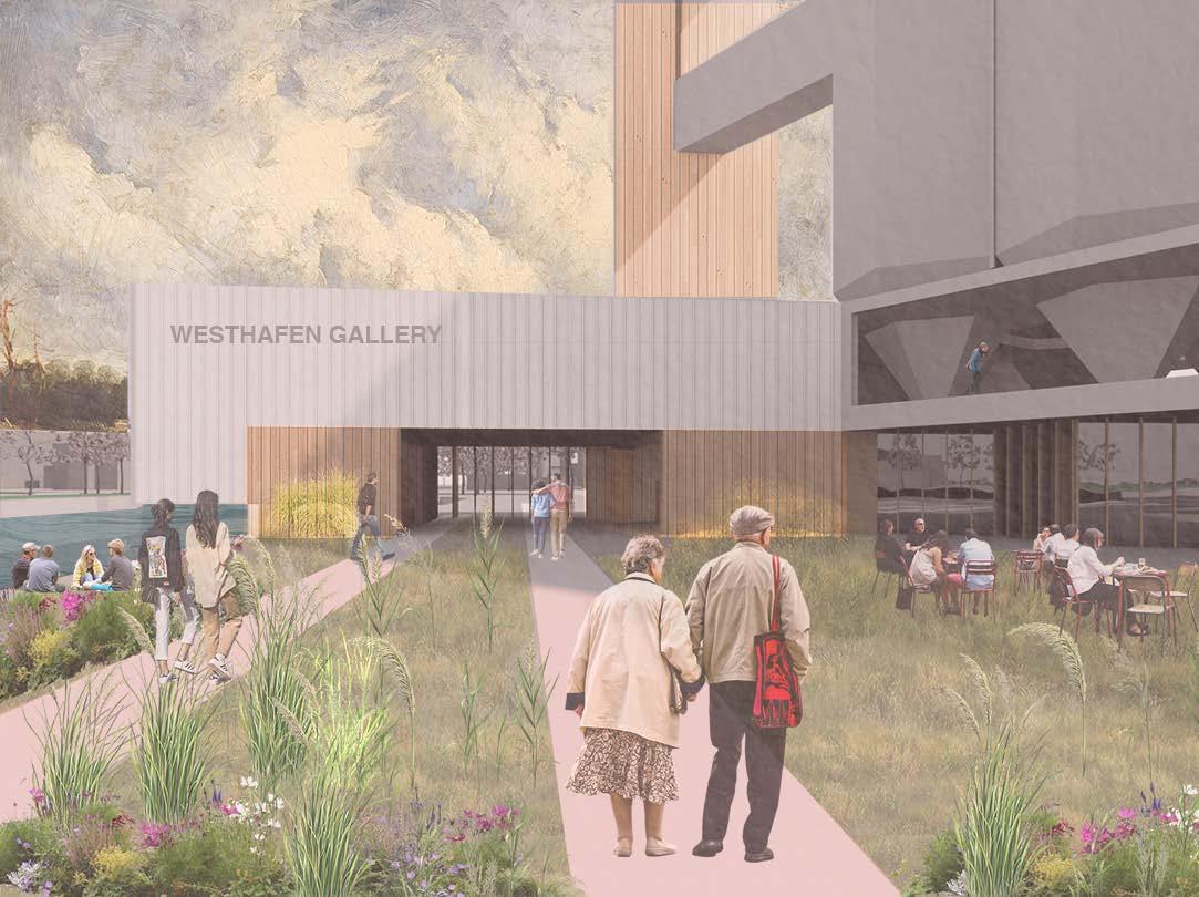 3. Render Collage, Perspective, showing existing warehouse and entrance to ticket and shop.