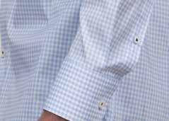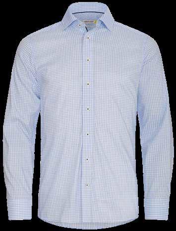 FEATURES • 22% long staple compact cotton, 51.5% Lyocell, 22.5% recycled Polyamide, 4% recycled Elastane, 99 G/M2 • Stretch with Easy Care • Tall 4mm thick buttons • Curved hem • Soft modern cut-away collar with hidden button down • Fine twill weave with check pattern • Split back yoke • Soft round edge cuff with cufflink hole • Flat front placket
