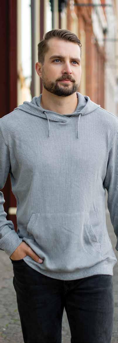 • Kanga Pockets with 1x1 Rib Knit Trim • Taped Neck Seam