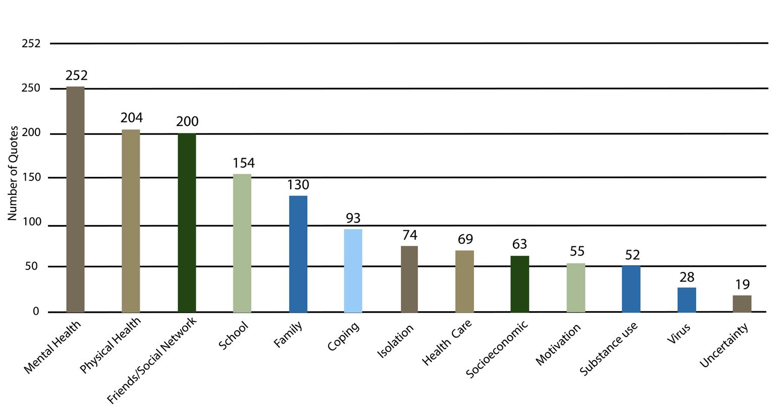 In our study, we hoped to gain a better understanding of the underlying cause of severe mental health decline in adolescents during the pandemic. After interviewing 20 AYA patients at JHACH, our team developed a coding system to summarize major topics discussed by patients when discussing their experiences during the pandemic (Figure 1). Major themes included declining mental health, a loss of motivation, changes to social relationships, the negative use of social media, and both positive coping mechanisms, such as drawing, and maladaptive coping mechanisms, such as substance use. Root causes of mental health decline included social isolation from online school, family conflict, socioeconomic challenges, and difficulties associated with accessing mental healthcare services virtually. After the onset of the pandemic, patients in the ED were 45% more likely to be diagnosed with depression, 56% more likely to be diagnosed with anxiety, and 25% more likely to be experiencing a drug overdose.