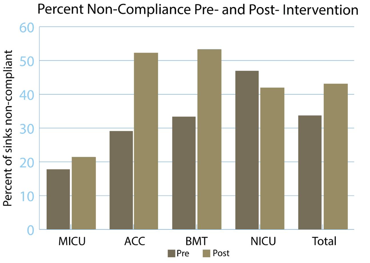 The data demonstrate that the distribution of the information sheet was not an effective intervention for altering the behavior of HCWs regarding the storage of items near sink basins. I was disappointed that the intervention did not work as intended and surprised that noncompliance actually increased post-intervention. This apparent increase may be due to my inexperience in the field of infection prevention, which could have led to some inaccuracies in data collection during the first two surveys, which I conducted pre-intervention. This may have caused me to observe a greater percentage of non-compliant sinks post-intervention, which could explain why there appeared to be increased noncompliance after the intervention on three units.