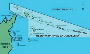 La Cordillera comprende las siguientes formaciones: los Farrallones, cayo Icacos, cayo Ratones, cayo Diablo, y la Blanquilla, cayo Cucaracha, arrecifes Hermanos, arrecifes Barriles, Palominito, Isla Palomino y cayo Lobo (estas últimas dos son de tenencia privada). Todas las islas son accesibles por botes, en buenas condiciones de tiempo, partiendo desde los pequeños puertos de Las Croabas y las marinas en el área de Fajardo.