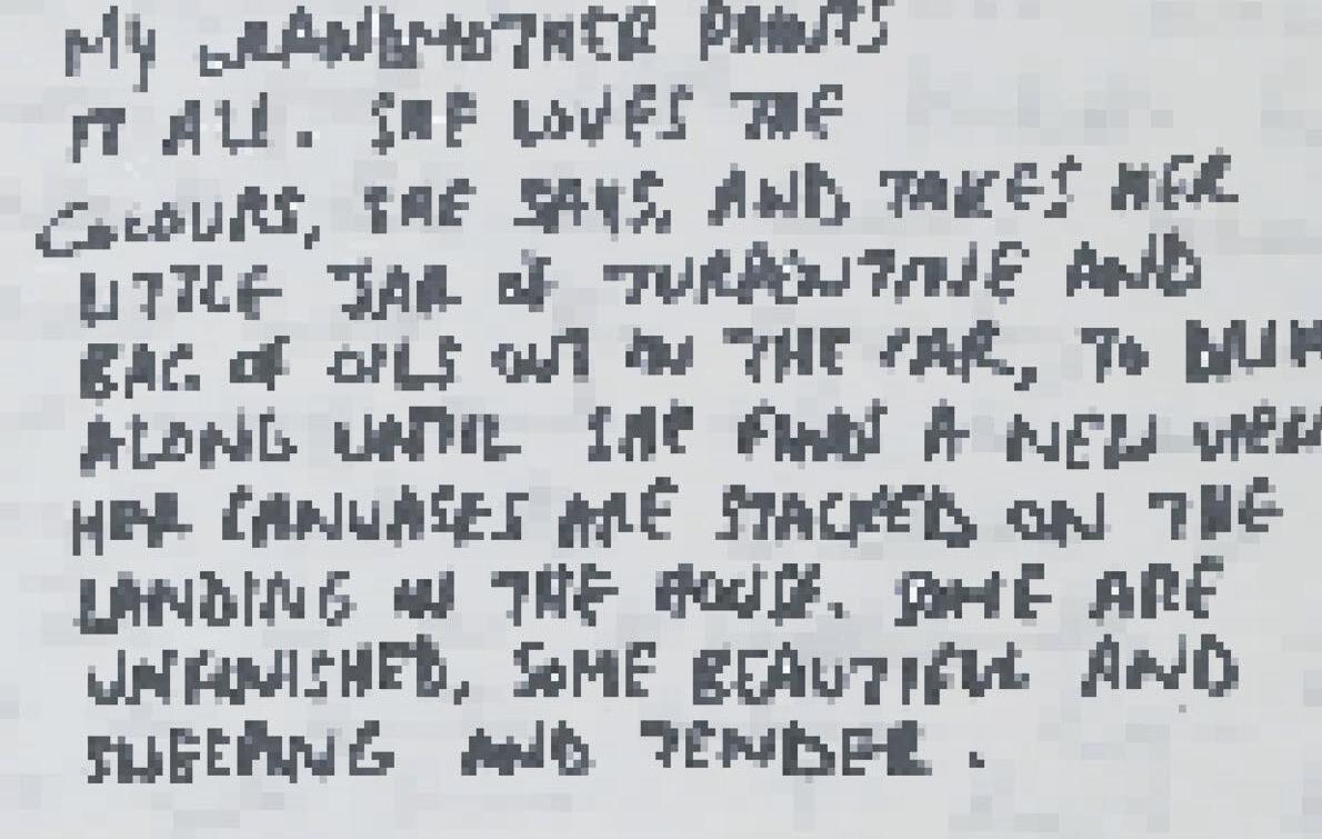 Lakes collect in indentations in the land, where the clay is too thick or the bog too saturated for the rain to drain. When the sun occasionally emerges, the moorlands are transformed into a patchwork of mirrors. The rs grow thick in the forests, and scotch pines down near the coast are bent and blistered by salt winds. My grandmother paints it all. She loves the colours, she says, and takes her little jar of turpentine and bag of oils out in the car, to drive along until she nds a new view. Every corner of road and eld is memorialised in her canvases, stacked on the landing in the house. Some are un nished, some beautiful and sweeping and tender.