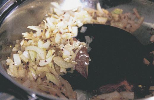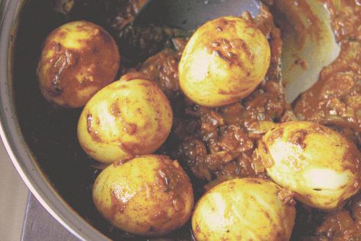 We would start with ghee, cumin, cardamon, bayleaves chillies and cinnamon sticks, saute in the diced onions, and garlic and ginger paste and add in powdered spices such as turmeric and chilli powder. We would fry the boiled eggs in a different pan with some ghee, turmeric and salt. We would then add in the eggs to the curry base, pour in some water and allow to simmer until the curry thickens again.