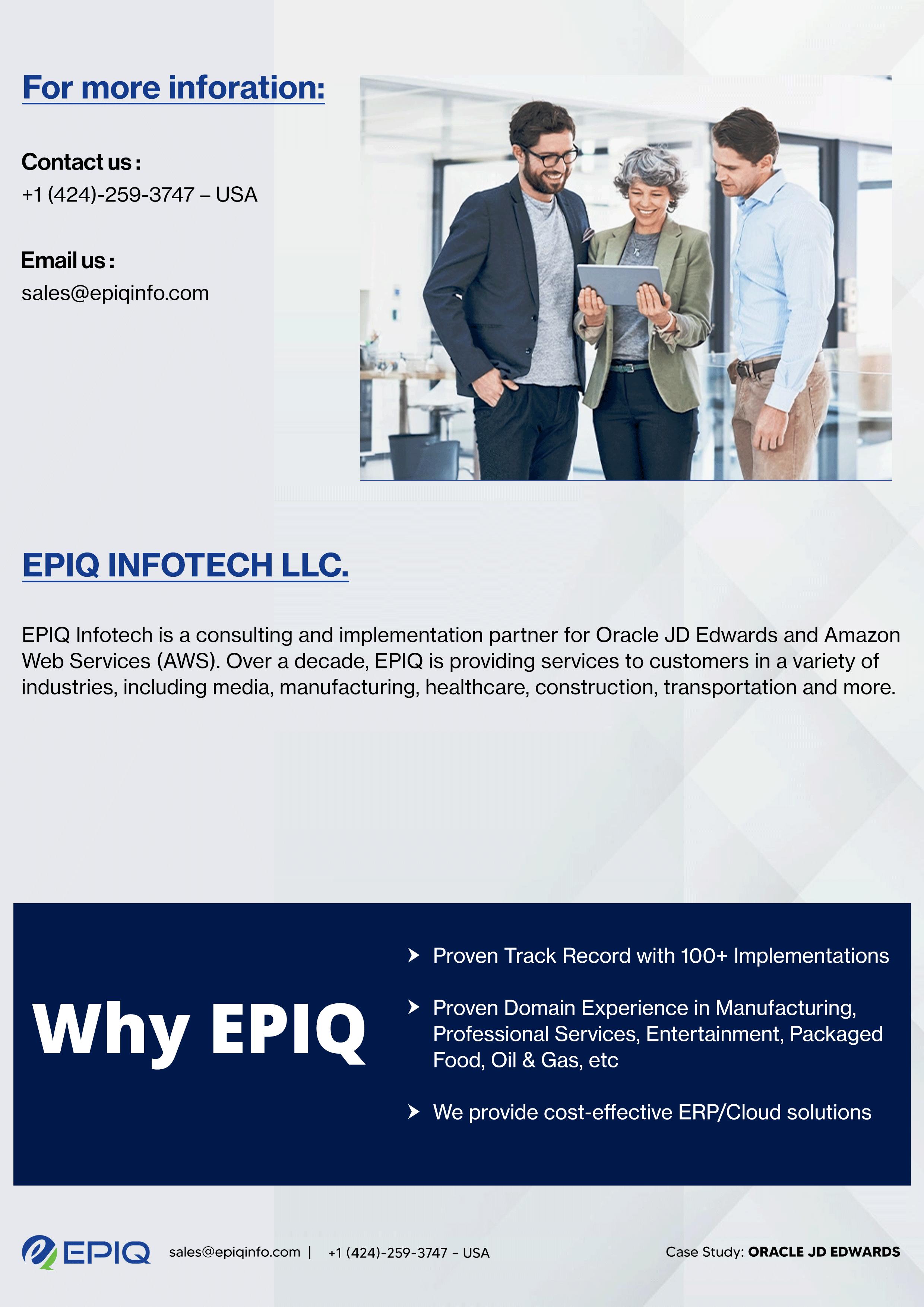 JD Edwards provides more than 80 distinct applications that cater to a wide variety of processes, offering numerous advantages. EPIQ is a leading JD Edwards Partner that specializes in providing comprehensive Oracle JD Edwards services to businesses, with the ability to deliver innovative solutions that enhance efficiency, reduce costs, and drive business growth.