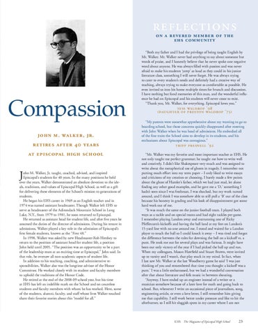ohn M. Walker, Jr. taught, coached, advised, and inspired Episcopal’s students for 40 years. In the many positions he held over the years, Walker demonstrated an absolute devotion to the ideals, traditions, and values of Episcopal High School, as well as a gift for delivering these elements of the School’s mission to generations of students. He began his EHS career in 1969 as an English teacher and in 1974 was named assistant headmaster. Though Walker left EHS to serve as headmaster of the Adirondack Mountain School in Long Lake, N.Y., from 1979 to 1981, he soon returned to Episcopal. He returned as assistant head for student life, and after five years he assumed the duties of the director of admissions. During his tenure in admissions, Walker played a key role in the admission of Episcopal’s first female students, known as the “First 48.” In 1998, Walker was asked by new Headmaster Rob Hershey to return to the position of assistant head for student life, a position John held until 2005. “The position was an opportunity to be a part of the leadership team at an exciting time at Episcopal,” John said. In that role, he oversaw all non-academic aspects of student life. In addition to his teaching, coaching, and administrative responsibilities, Walker also was the longtime advisor of the Honor Committee. He worked closely with its student and faculty members to uphold the traditions of the Honor Code. He retired at the end of the 2008-09 school year, but his time at EHS has left an indelible mark on the School and on countless students and faculty members with whom he has worked. Here, some of the students, alumni, faculty, and staff whose lives Walker touched share their favorite stories about this “model for all.”